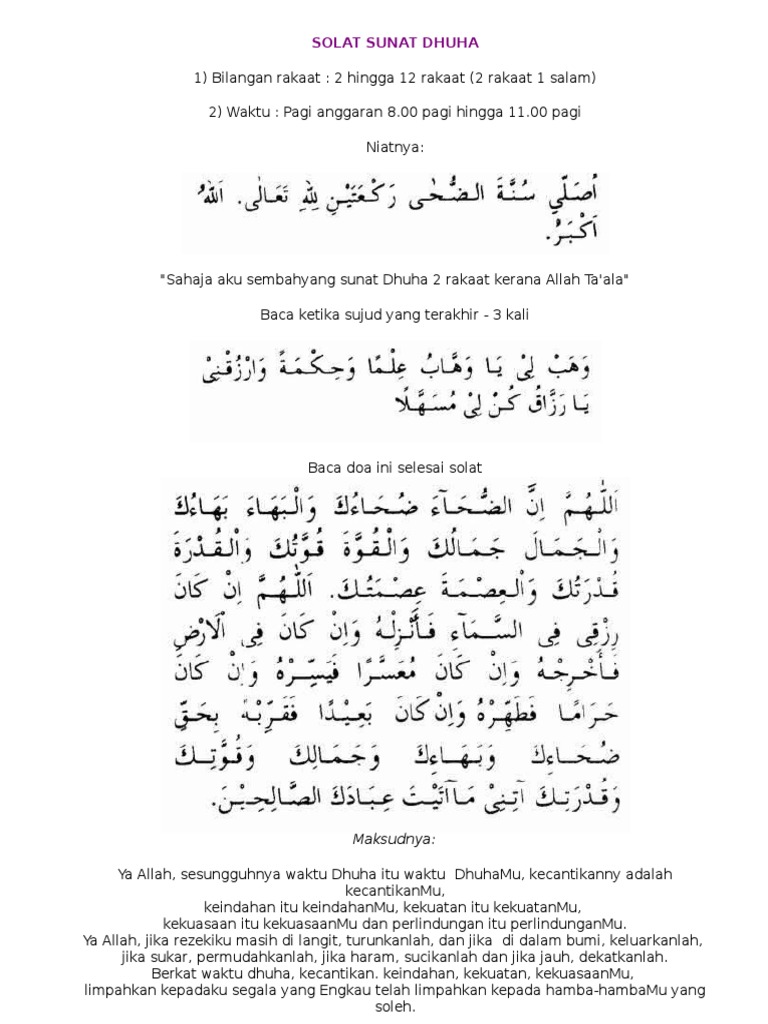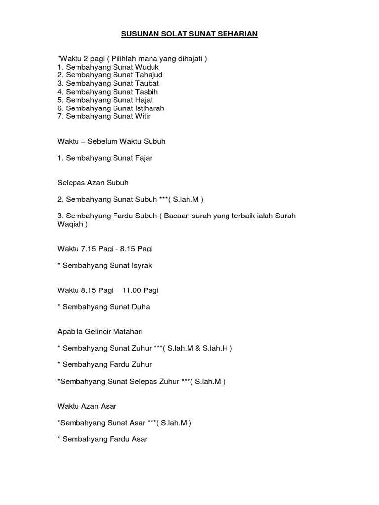 Solat adalah satu ibadat yang memperhubungkan hamba dengan tuhannya, mengandungi beberapa perkataan dan perbuatan yang dimulai dengan takbir dan disudahi dengan salam. Penjelasan waktu solat sunat subuh atau fajar & waktu isyraq. Sekira cuacanya berhalangan adalah lebih mudah dengan merujuk kepada takwim. Solat sunat disebut juga solat nawafil atau tatawwu' iaitu solat yang dilakukan secara sukarela untuk mendekatkan diri kepada allah. * waktu haram utk solat (kecuali di. Berikut adalah waktu yang diharamkan solat (sebagian ulama mengatakan berlaku bagi selain tanah haram) Dan di manakah batasannya antara waktu yang diharamkan dengan yang dibolehkan atau dengan kata dalam masa 24 jam yang dikurniakan allah سبحانه وتعالى kepada kita, tidak semua waktu boleh digunakan untuk melaksanakan solat2 sunat. Shalat sunat wudlusetiap kali seseorang berwudlu, disunatkan mengerjakan shalat sunat wudlu dua rakaat, dan cara mengerjakannya yaitu: Selepas solat sunat aidil fitri sehingga sebelum terbenam matahari. Hingga yang akan kita dapatkan adalah dosa bukan pahala. Tetapi ada juga para kiyai yang mengatakan sunat fajar dilakukan setelah masuknya waktu subuh. Solat sunat dhuha dilakukan pada waktu matahari sedang naik. kecuali bagi mereka yang berada di tanah haram.